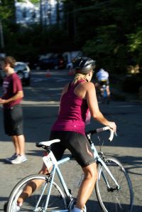 When I told my dad I was going to do triathlon, he said “I didn’t know you swam.” Now my parents have a pool where we spend many, many warm summer days , but my definition of swimming is floating around on a raft in the middle of the pool while reading a book, so I guess he did have reason for concern. But I was motivated; I bought a racing swim suit and hit the pool at our Y. Now just let me say that there is nothing more ugly and humiliating than a one piece racing swim suit. It flattens all of the wrong parts, causing other parts to bludge, and, since it is so tight-fitting, your fat has to escape somewhere and it does so in all the wrong places. Add a swim cap and goggles and it is pretty scary. I banned my husband from seeing me in my suit because that was not the image I wanted him to have of me! Despite this, I did manage toget to the Y often enough that drowning during the race would not be a concern.
