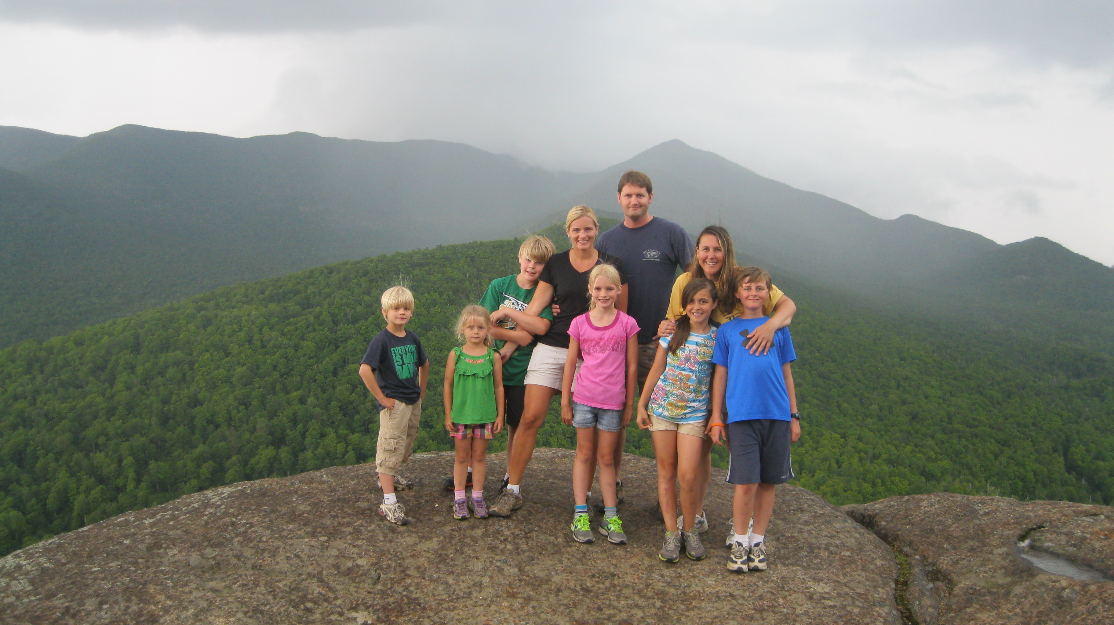 My voice obviously contained enough force and fear that they all immediately ran to join me where I was under the trees. Just as I had been getting ready to take the picture, I suddenly saw the hair on their heads stand up on end! The charge had built up enough in the kids and in the clouds that there was a very good chance that they were about to be struck by lightning! They made it to the trees and the rest of the adults, hearing me yell with fear in my voice, came running to see what had happened. We made a decision to get off the top of the mountain, but first we wanted to take a picture of everyone. Again, wilderness stupidity prevailed! So, we all lined up on the edge of the mountain overlooking the valley, mountains in the distance and the storm much closer now, as Jeff fiddled with my camera (very inferior to his Sony alpha but it’s all we had!) in attempts to get the timer to work. He never did get the timer to work (cheap camera!) but as we were waiting he looked up and again saw the hair on our heads standing up even though our hair was now wet from the rain (look closely at the picture below and you can see it!). We quickly snapped a picture and we were off. Lightening was all around us!