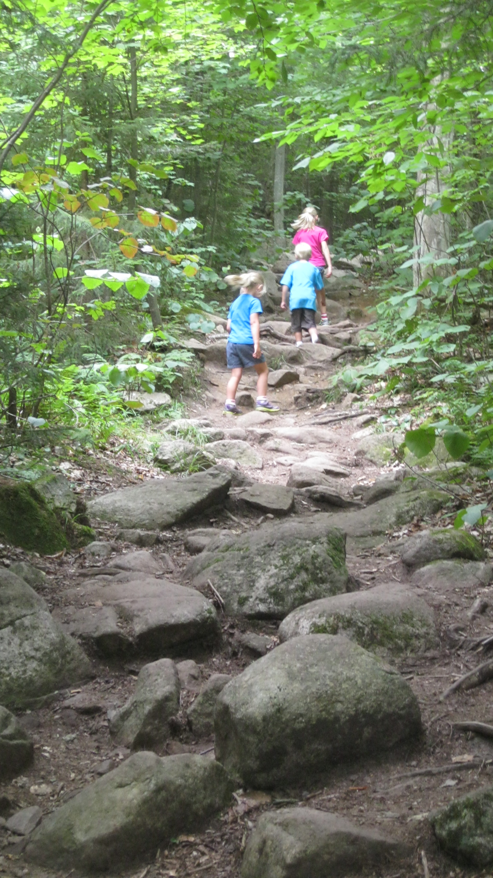 The three kids (we were down one due to summer camp) bounded ahead on the trail, laughing and racing each other. The first mile is really pretty flat and easy, but very worn. You could tell this is a popular hike, the trail is worn down to the roots and rocks. I guess it can be quite wet judging on how many boardwalks there are on the trail, but we encountered no water or mud on this hot July day. There are also 5 geocaches along the way which kept the kids entertained and allowed for frequent stops. Then, about halfway up, the trail turned steep.