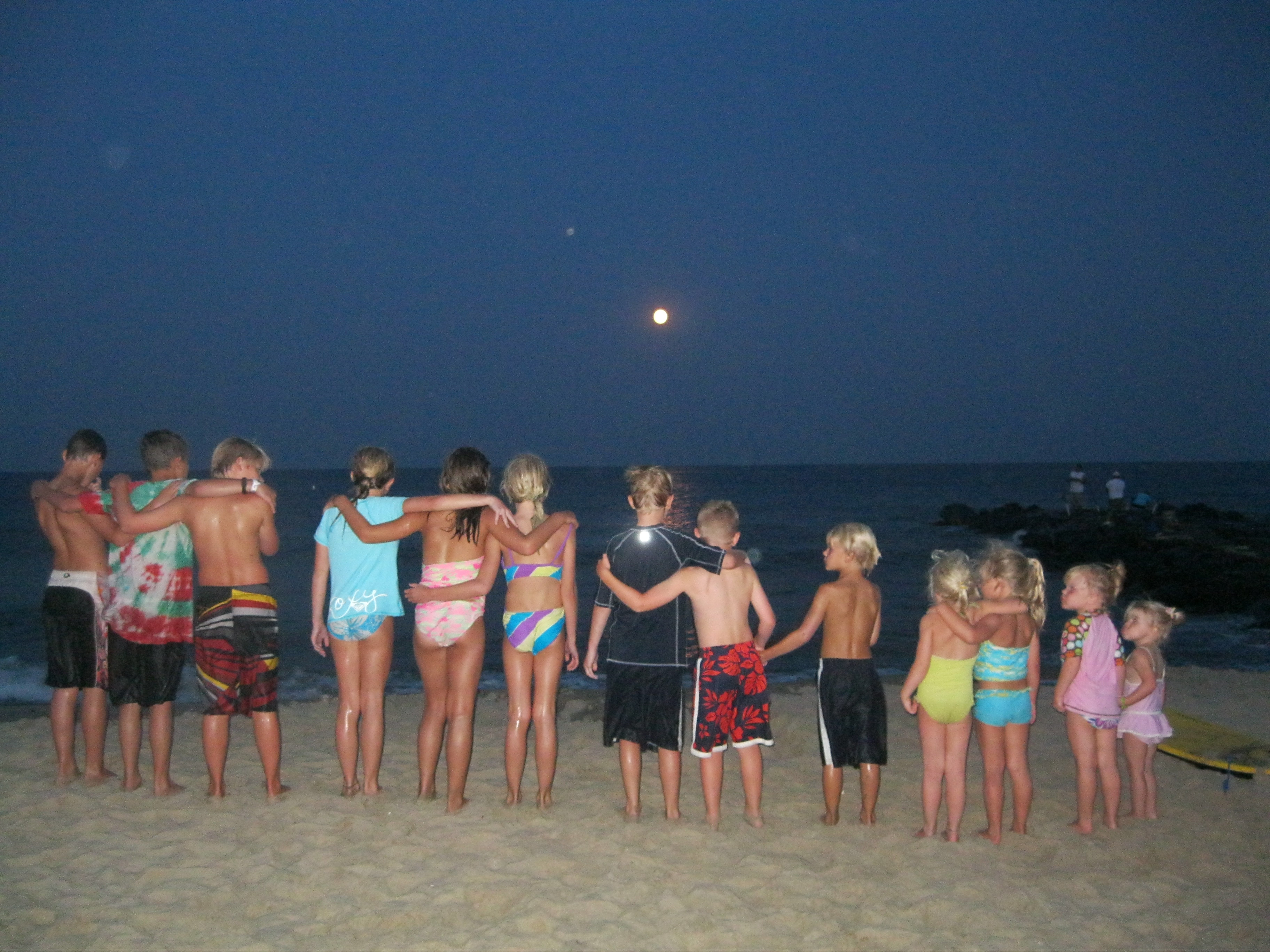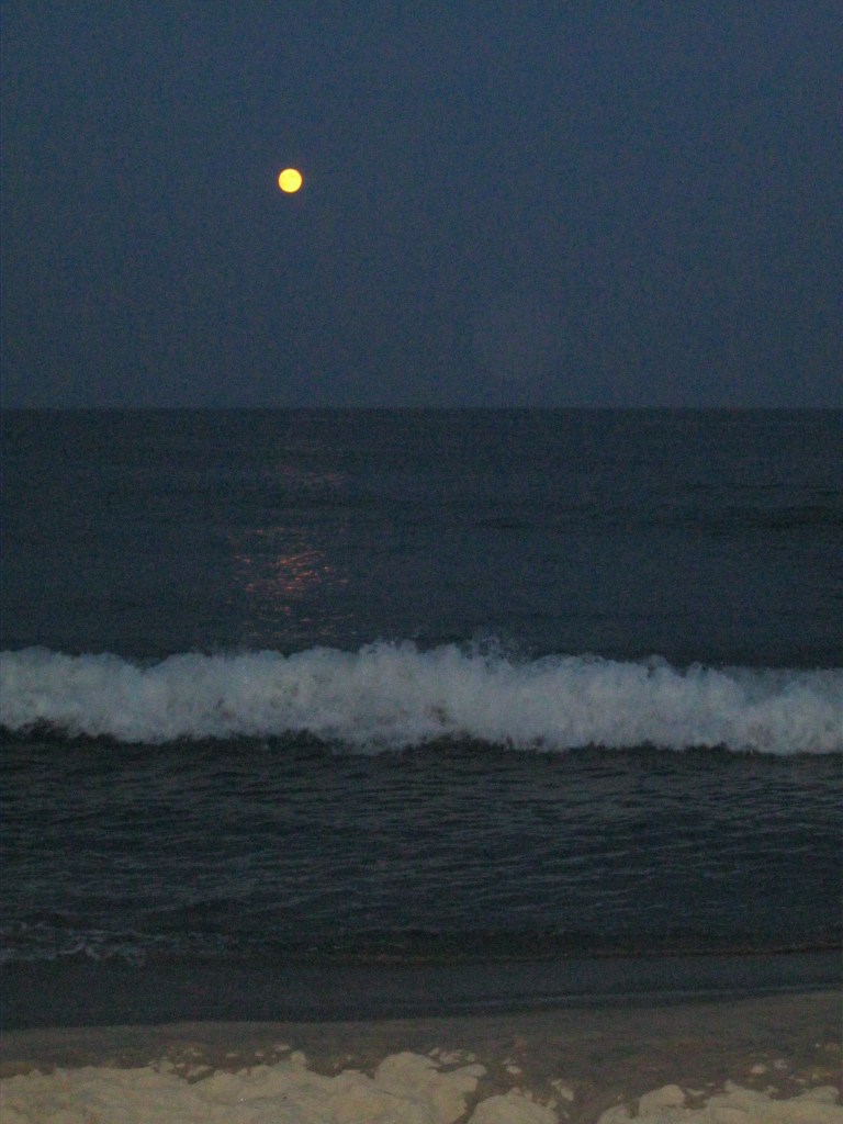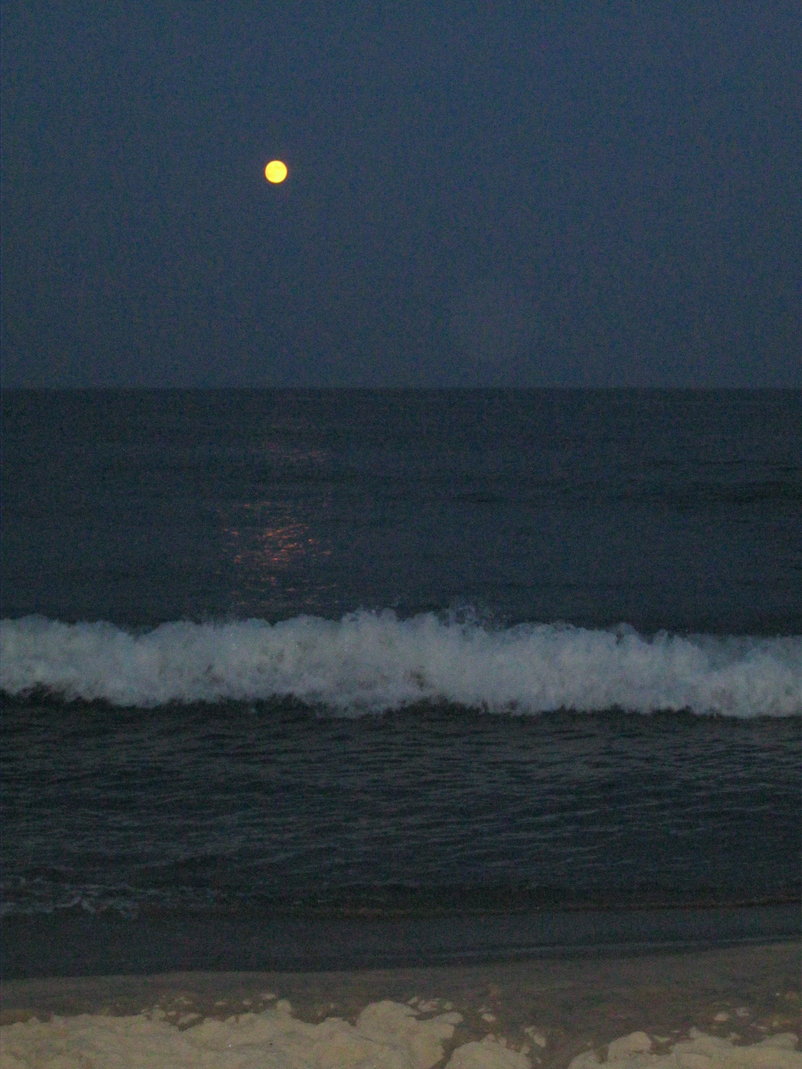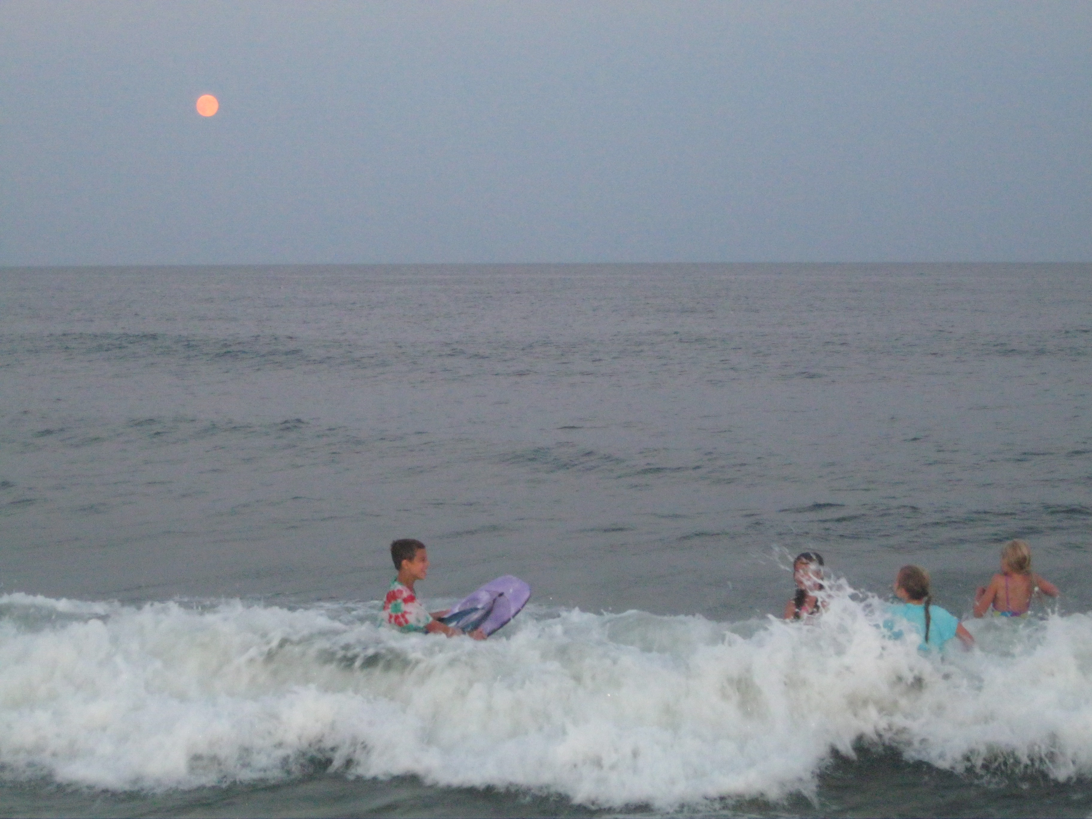 The sun set leaving a brilliantly orange and red sky as we ate. Then, over the ocean, the moon rose. A blue moon! The sky darkened and the full moon rose, higher and brighter. The kids ran into the ocean to swim with the moon. Moonlight shone on them as they laughed and splashed in the warm water. It was a moment frozen in time. Summer may be over and school starting, but right now nothing else mattered. Nothing but good friends and warm air and salty waves in the moonlight. A moment that will carry us through the long dark winter months. A lifetime memory.