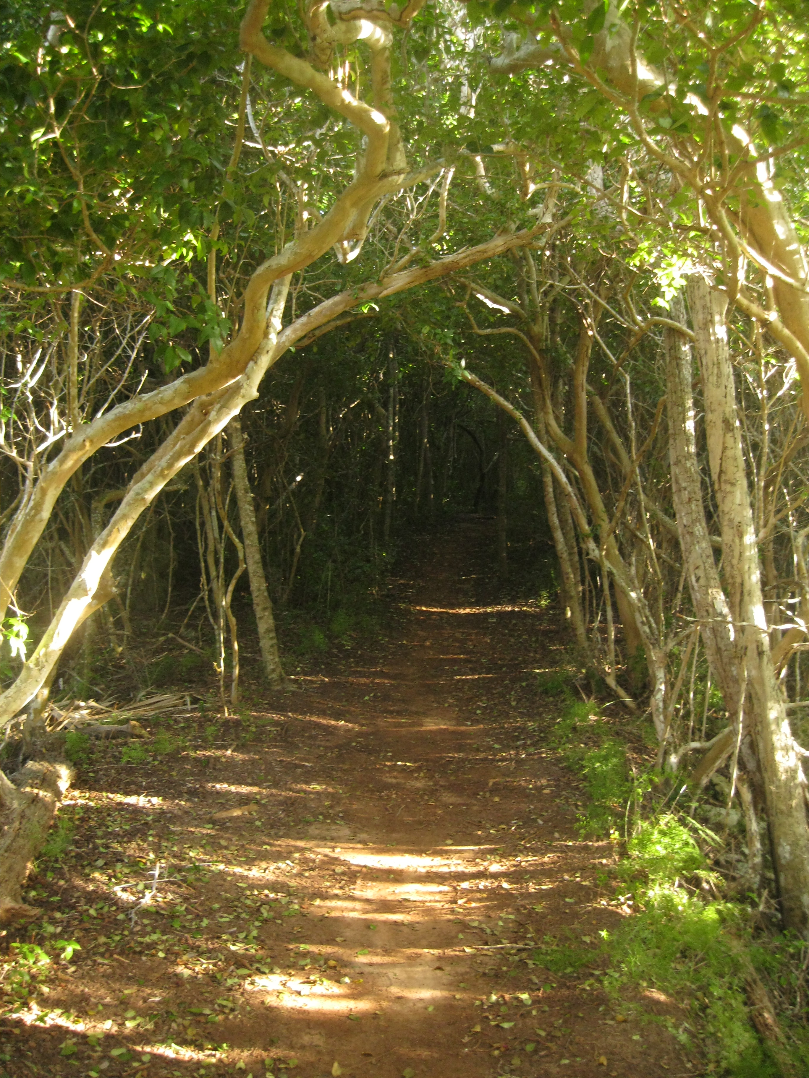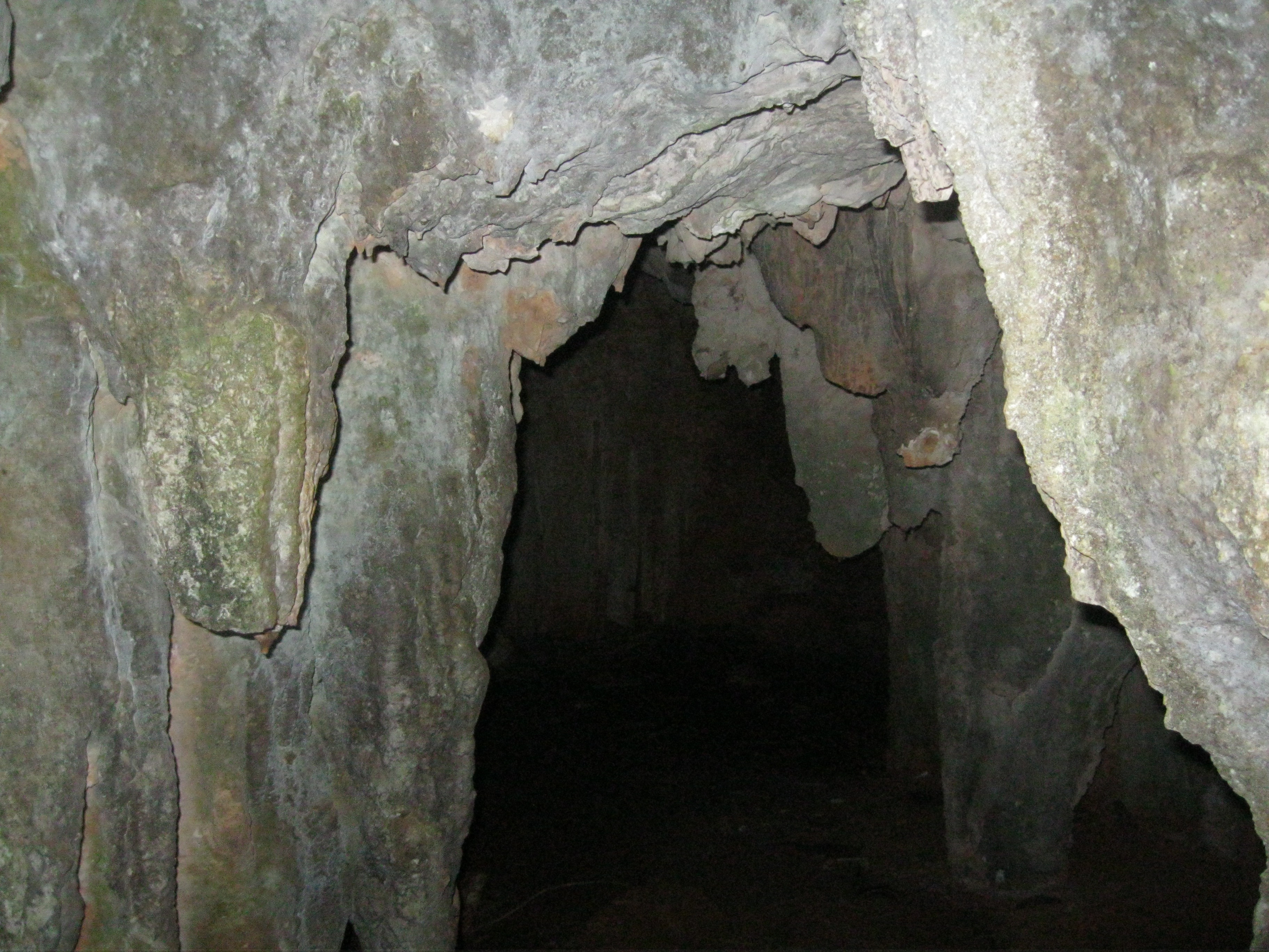 Back on the main path we soon spotted a barely visible trail heading off to the right deep into the thick undergrowth. My husband thought that it may just be a herd path but I was pretty sure that this was it, our route to a cave. We started on the path and were soon ducking low to avoid the tangle of vines and tree branches that were overhead. The vegetation quickly enclosed us and we could not see more than 10 feet in front or behind us. Branches scraped at our legs and arms and thick fronds hit our faces, yet we continued. A few times we made a wrong turn, losing the near invisible path. Finally we came to a pile of rocks that seemed to lead down a steep hill. We peered over the mound and there it was, our hidden cave!