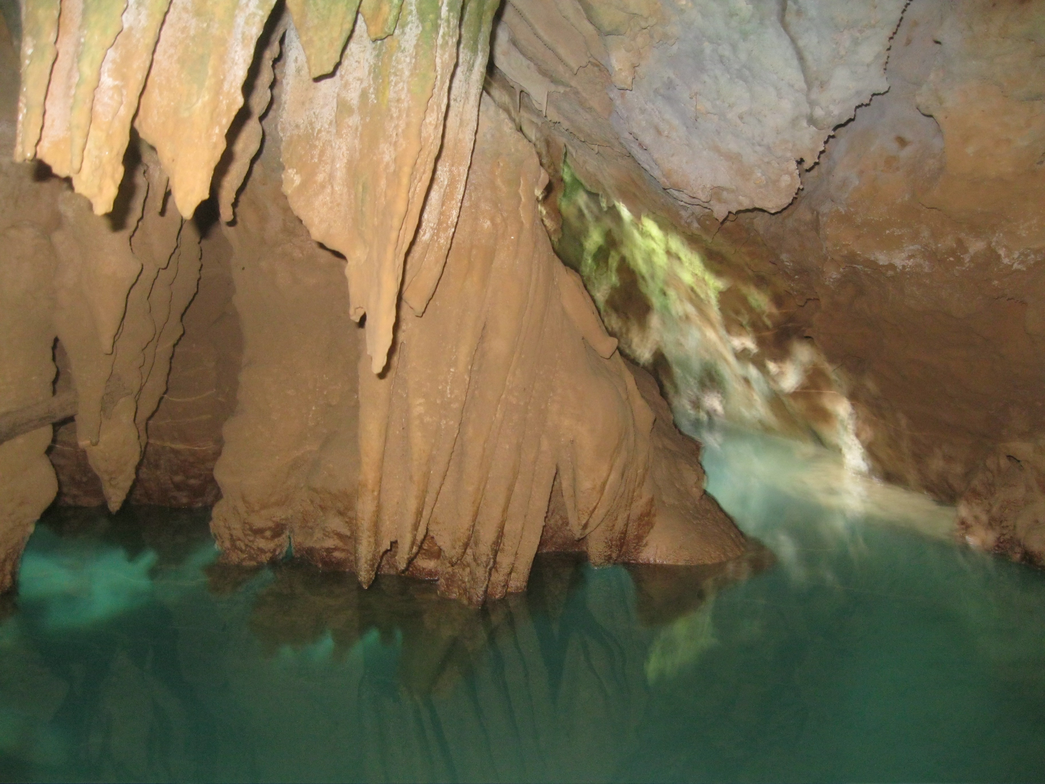 “We’ve got to swim here!”, my husband cried. I agreed. How often do you get to swim in a grotto filled with crystal clear water deep in the jungles of an island? We slipped into the warm water and swam towards the other side. My husband reached it first and exclaimed how cold the water was there. We looked down and saw that it was deep here, too deep to see the bottom. The water here was coming from deep inside the earth! I got out of the water, but my husband decided to swim further into the cave. This required swimming underwater through a short tunnel of stalactites and stalagmites right over the cold water coming from the depths. This freaked me out a bit, so I passed. My husband made it without issue and went on to explore the other side of the cave.