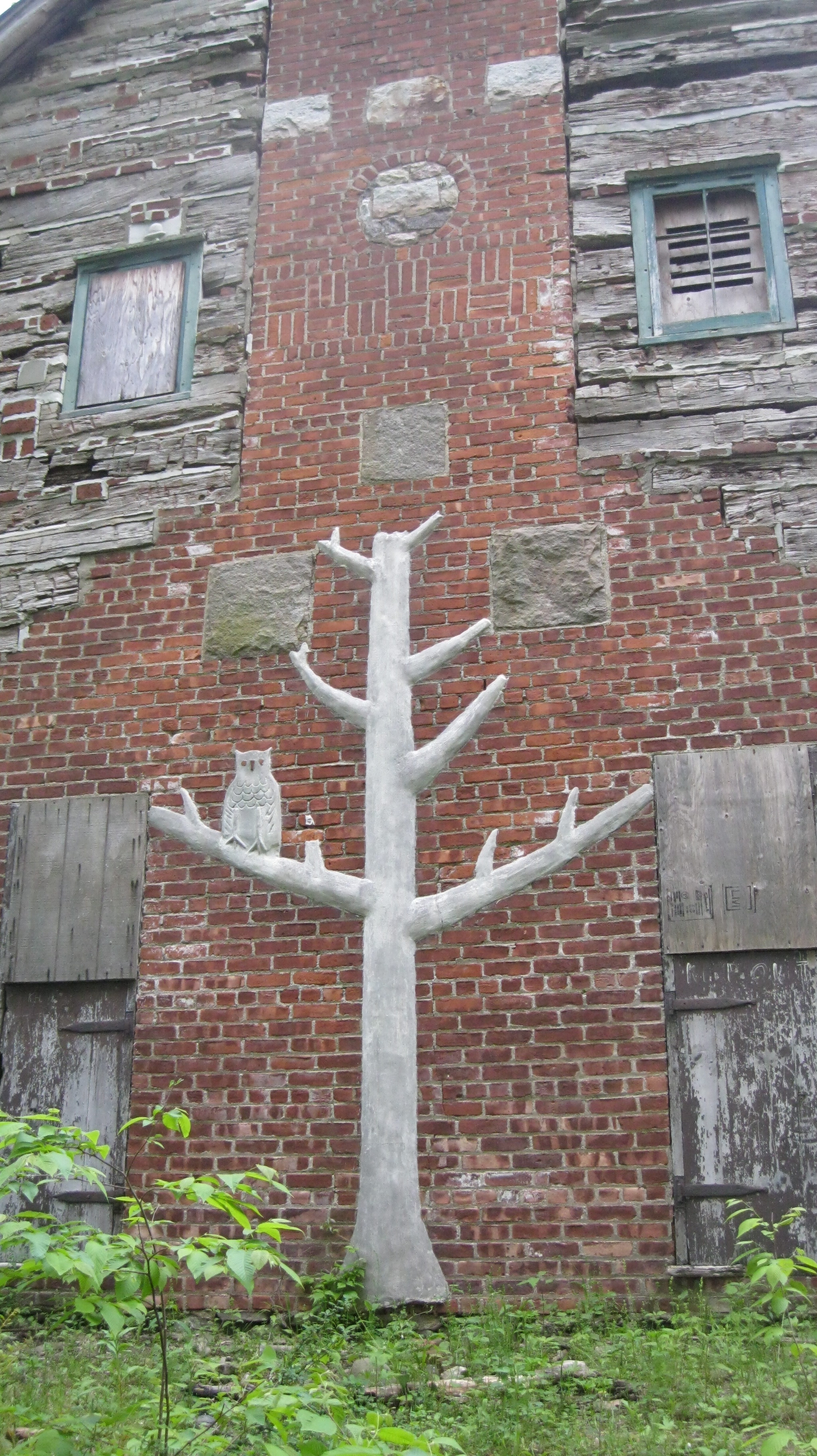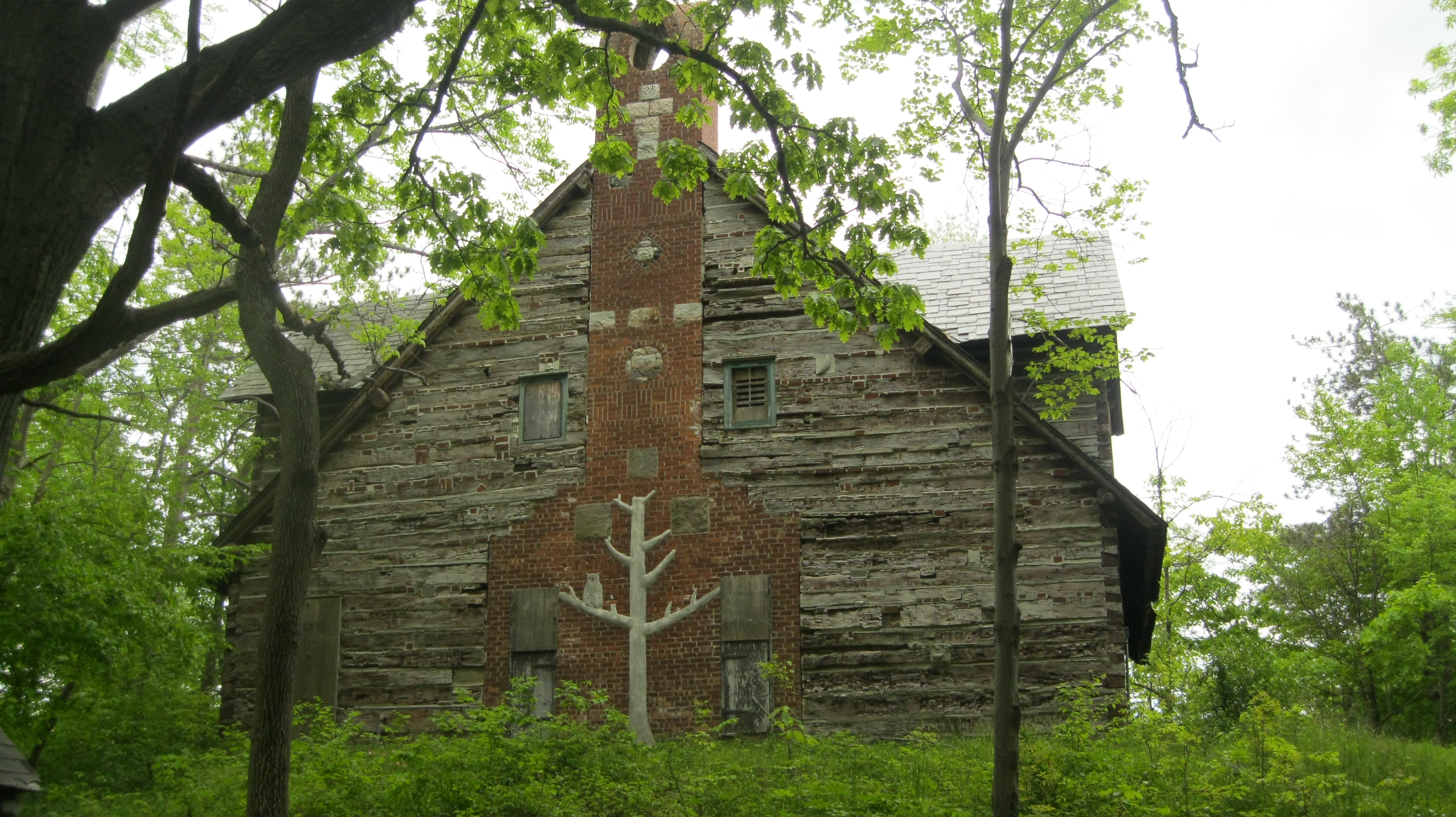On a warm spring day this past year we went on a short hike to explore another forgotten building.  We hiked up an old rutted road that was slowly being reclaimed by the forest.   The road climbed and twisted and soon we found ourselves staring up at a whitewashed tree with a huge white owl on a branch!  Had we wandered into a magical wonderland?  No, we had found Outlook Lodge!