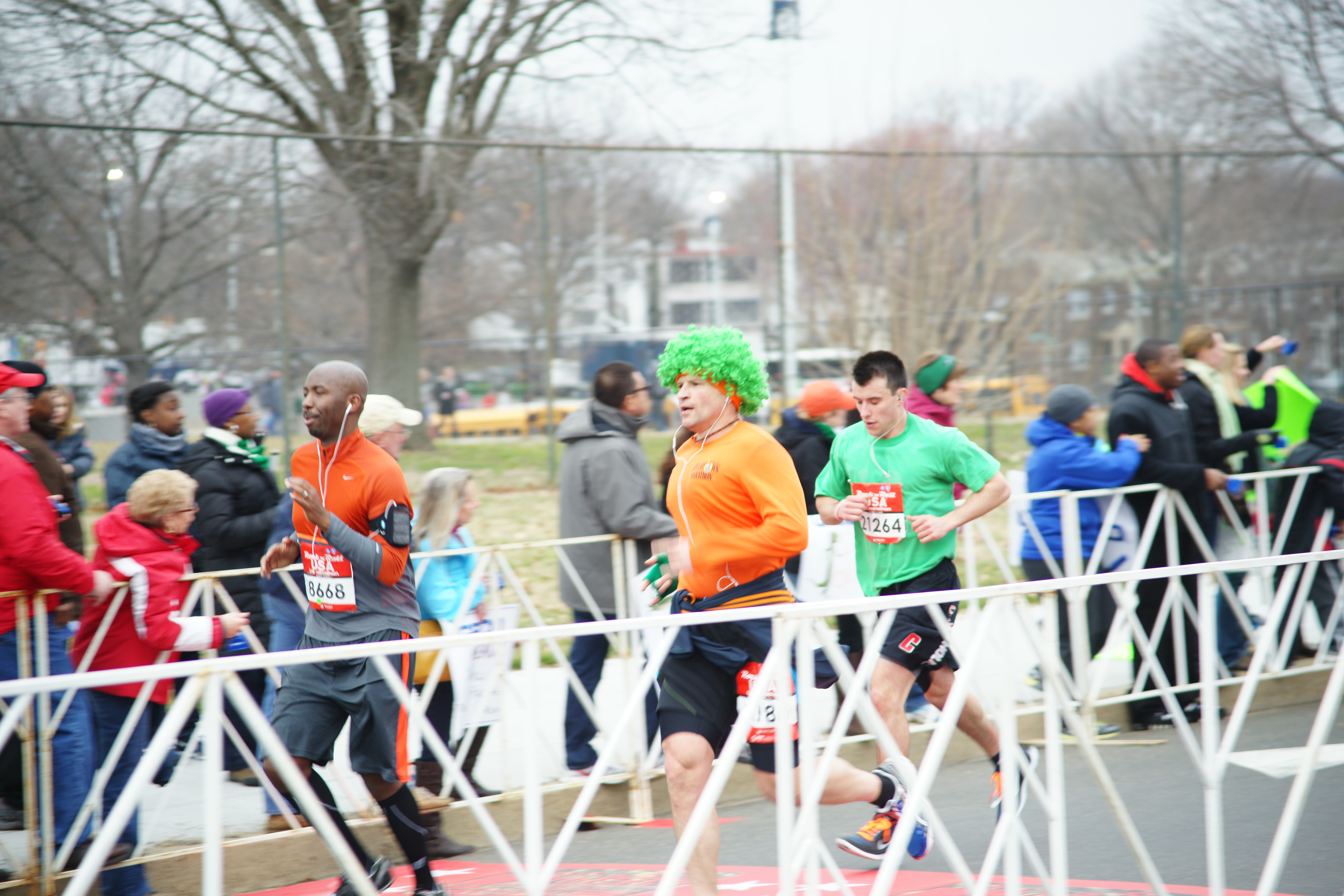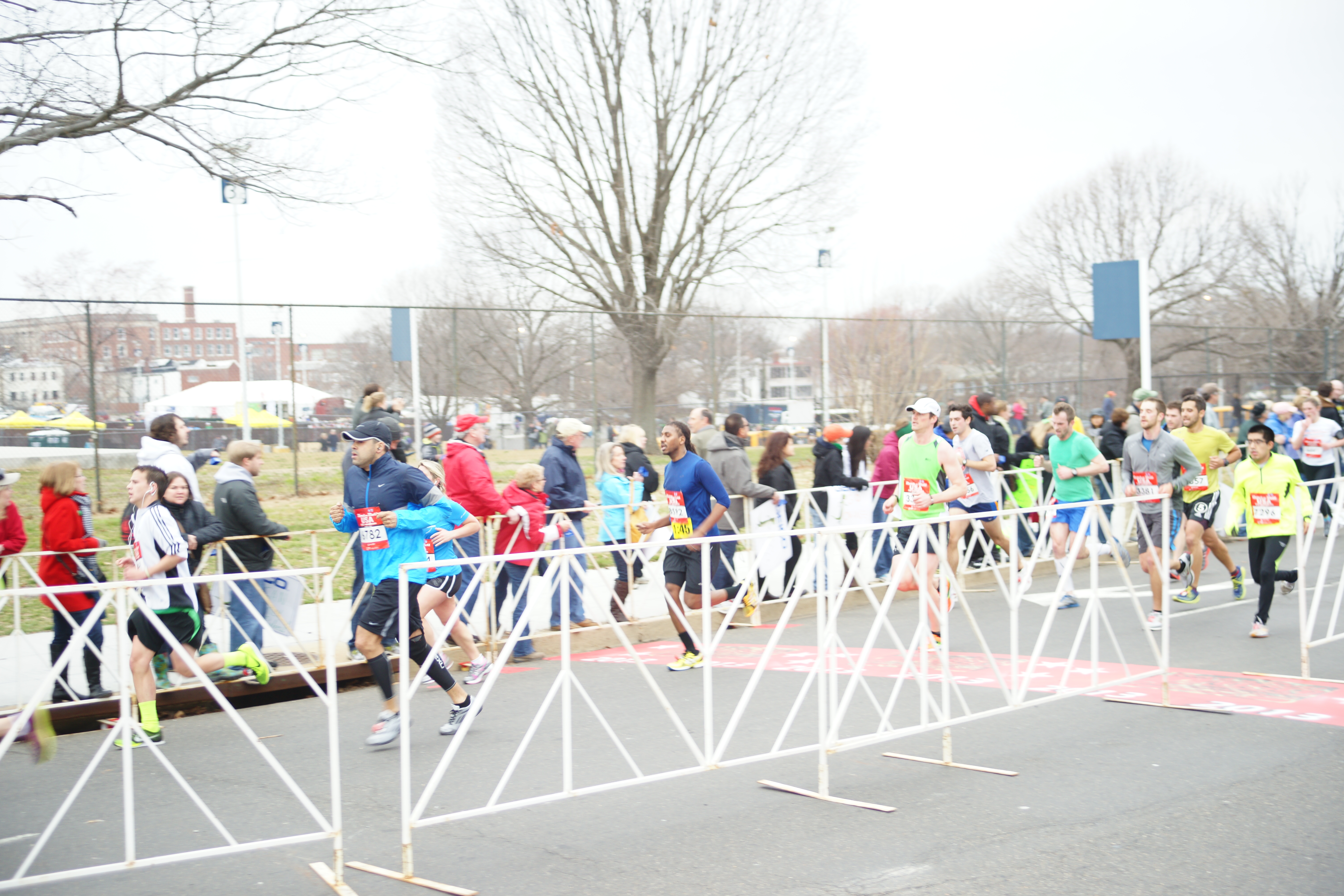 The cab driver dropped us off as close as he could get to the starting line and we began walking over. A few blocks in I met up with Kori and we hurried to the bag check and then to find our starting gate. At this point we were down to about ten minutes before the beginning of the race. There were, of course, people everywhere and, of course, the port-a-john line was insane! Desperate we saw that an emergency shrubbery bathroom had formed. We hurried over and went to the women side and took care of business! Relieved, literally, we got back to our starting gate. (later that day I found a leaf in my pants!)