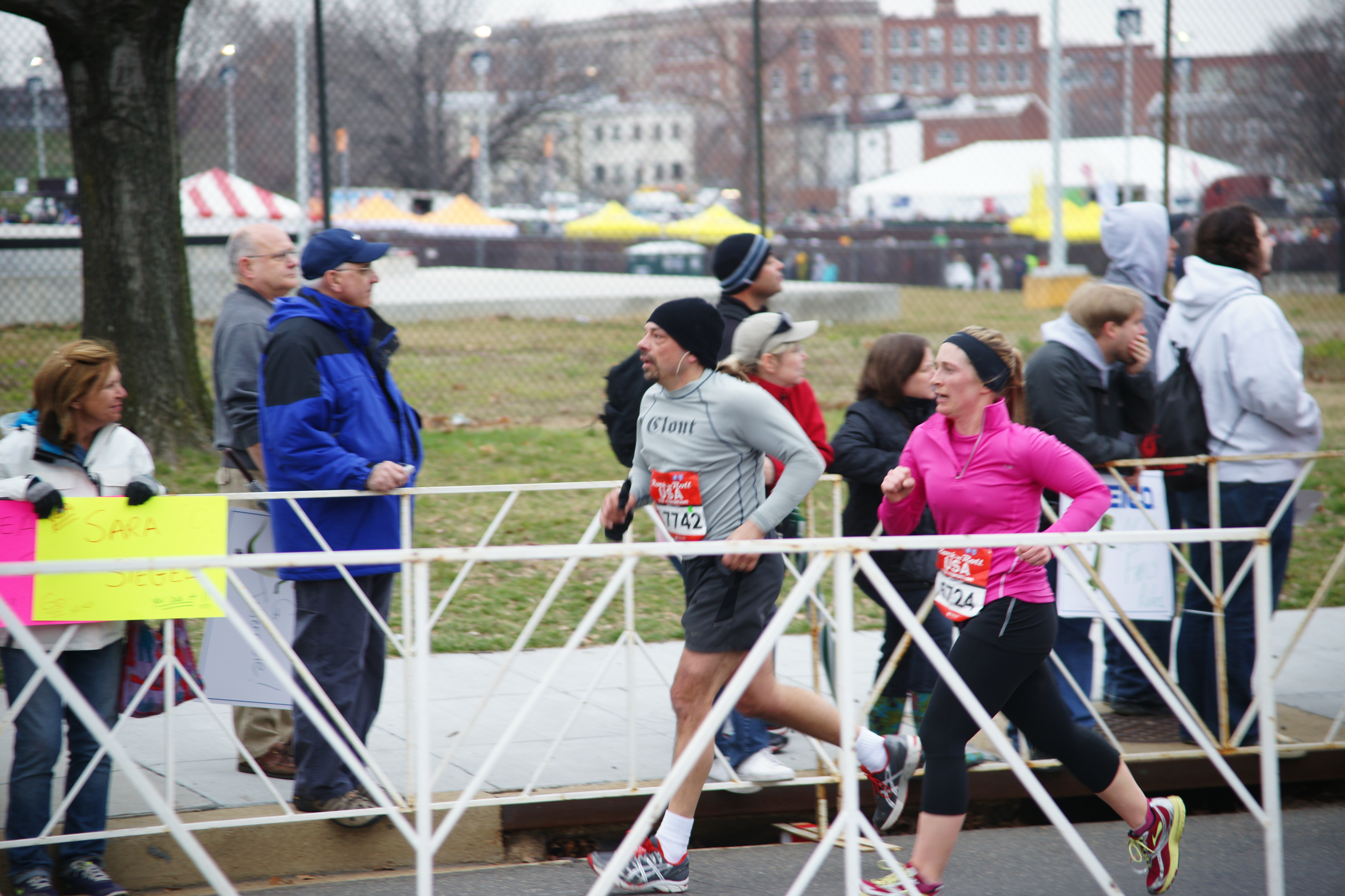 The first 5 miles I felt great! The weathermen had predicted drizzle for the day but there was no sign of rain. It was cloudy and in the low 40’s; perfect running weather! I ran at a good pace, averaging in the low 7:50’s per mile. It was fun to look around and smile at everyone and listen to conversations. Everyone was so upbeat! Each song that came on my iPod got me pumped!