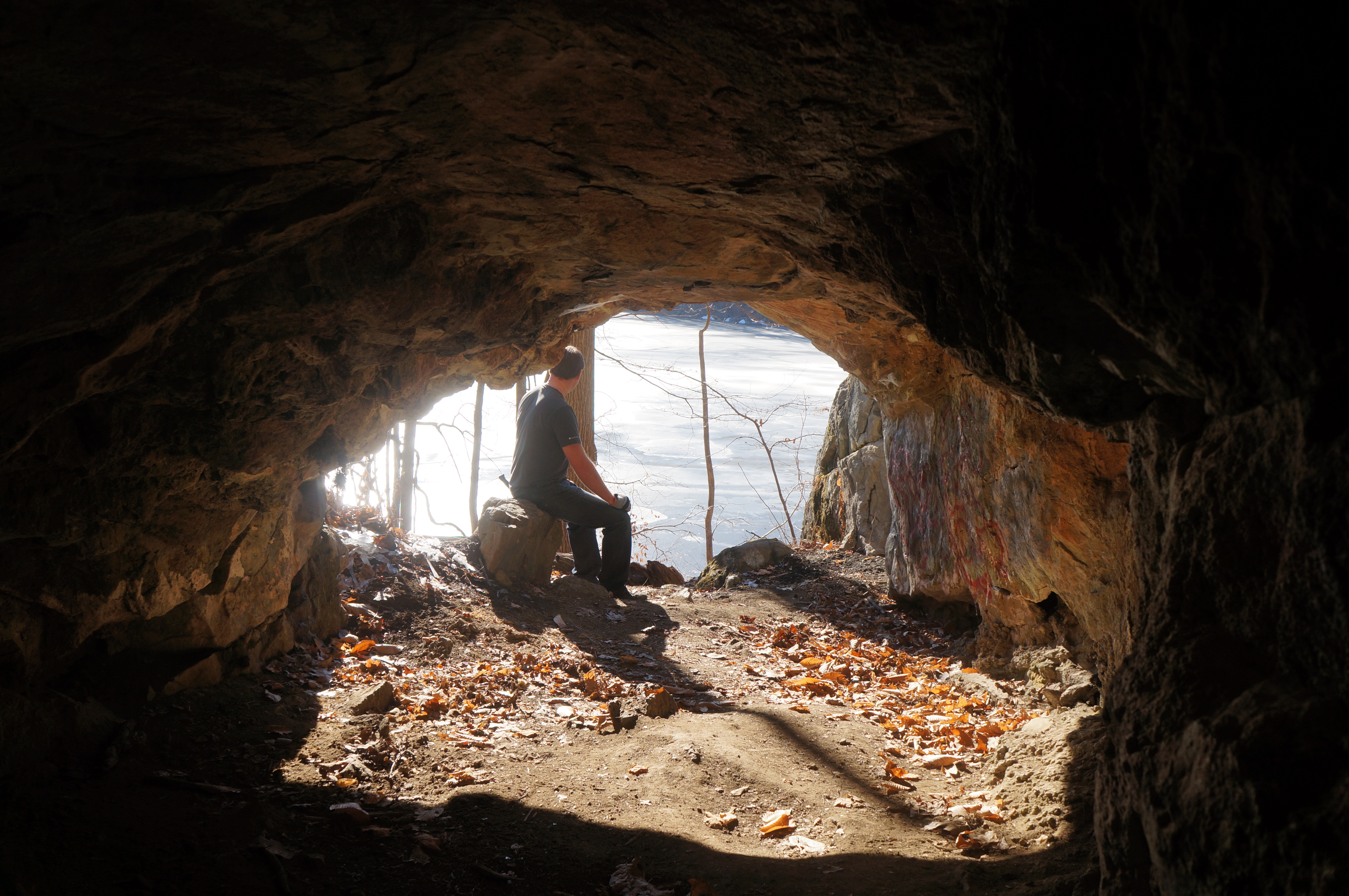 All too soon it was time to go.  Shadows were closing in quickly on this short winter day. The warmth of the winter sun had given way to a chill.  We headed back out and around the lake.  On the other side of the lake I stood and looked back at the cave.  From this viewpoint it was all but impossible to make out.  Rocks and trees and shadows hid the entrance.  The cave stood, as it has for centuries, waiting for another group of travelers to discover and explore it.