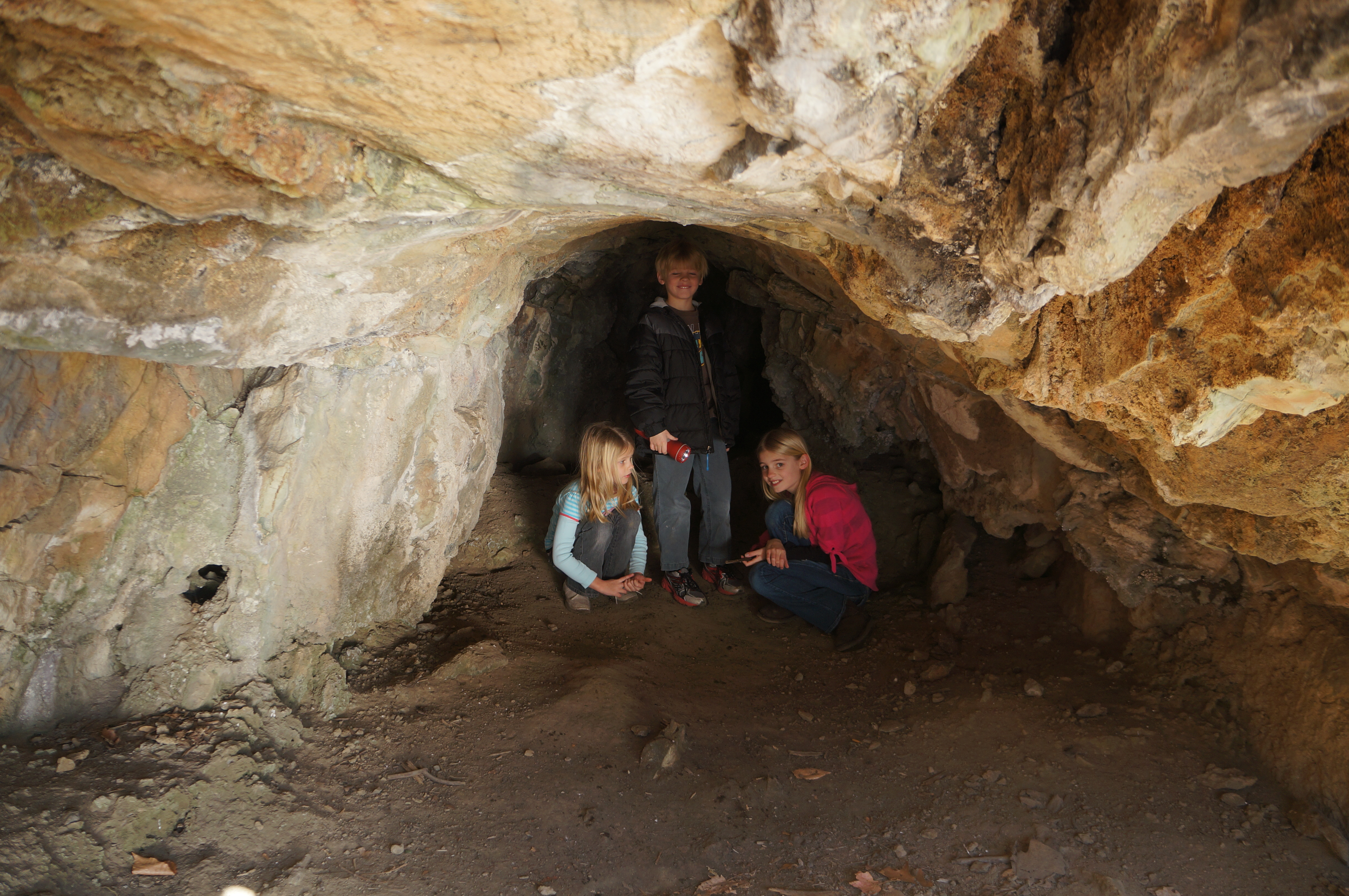 We rounded a corner, looked up, and there it was about 20 feet above us; the Fairy Hole.  It was an easy scramble up the hill to reach the entrance of the cave.  The kids quickly entered the cave and began to explore.  The opening was wide and tall, big enough for them to stand upright in it.  The ceiling became lower towards the back of the cave.  I broke out our headlamps so they could explore a little further.
