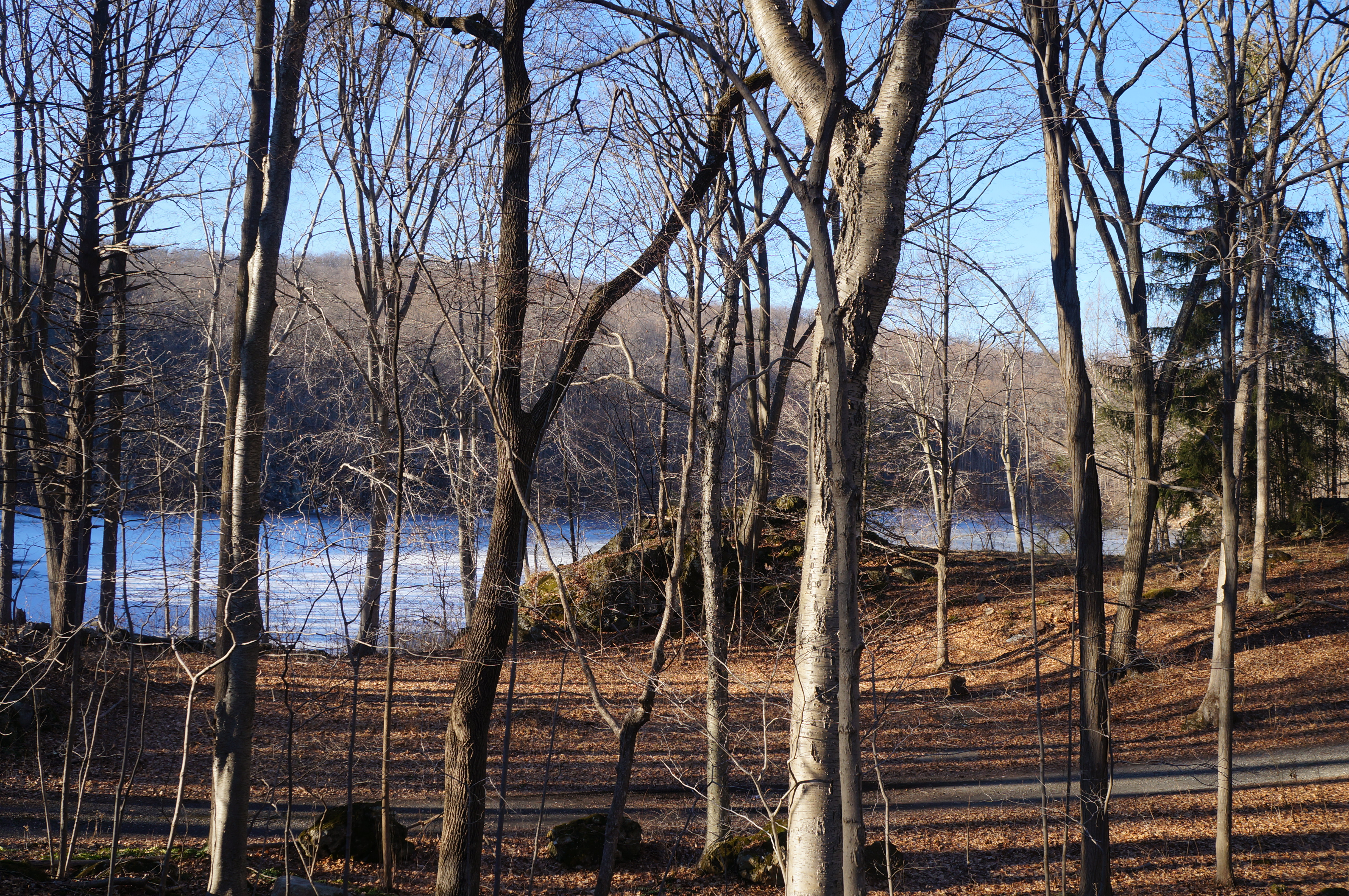 We parked near Ghost Lake and began to follow a faint trail around the lake.  The lake was not there during the time of the Lenape, but was created much later by two men who dammed a creek to create a lake between their homes.  The trail hugged the lake and wound its way up and over rocks and downed trees.  It was overgrown in many spots by trees and pricker bushes.