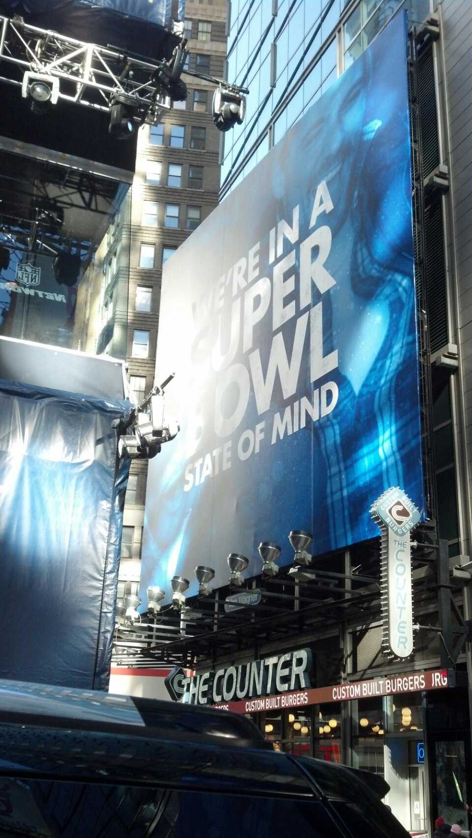 It was a balmy 10 degrees by the time we arrived. We parked a ways off to avoid dealing with traffic and quickly walked towards Times Square. Soon we were there along with hundreds of other people on Super Bowl Blvd.