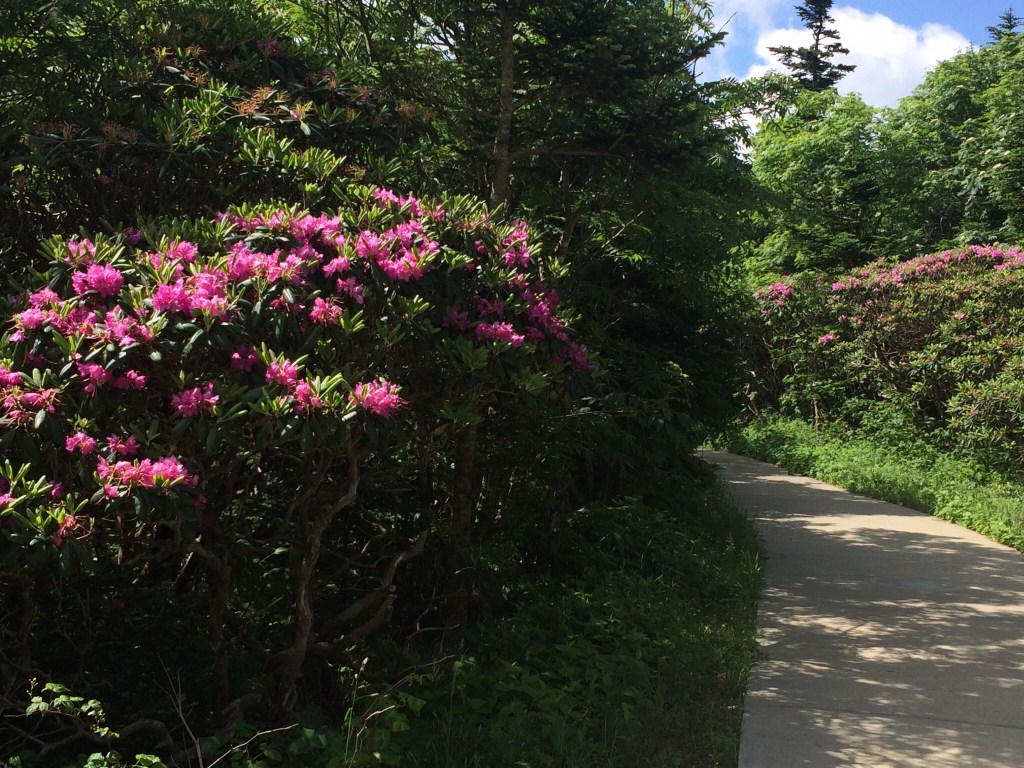Catawba Rhododendrons, native to the Southern Appalachians, bloom in late-May at lower elevations and in mid-June higher up. The purple-pink bloom lasts only for a short time but is beautiful. One of the best places to view them is at the Roan Mountain Gardens on the North Carolina side of the NC/TN state line.