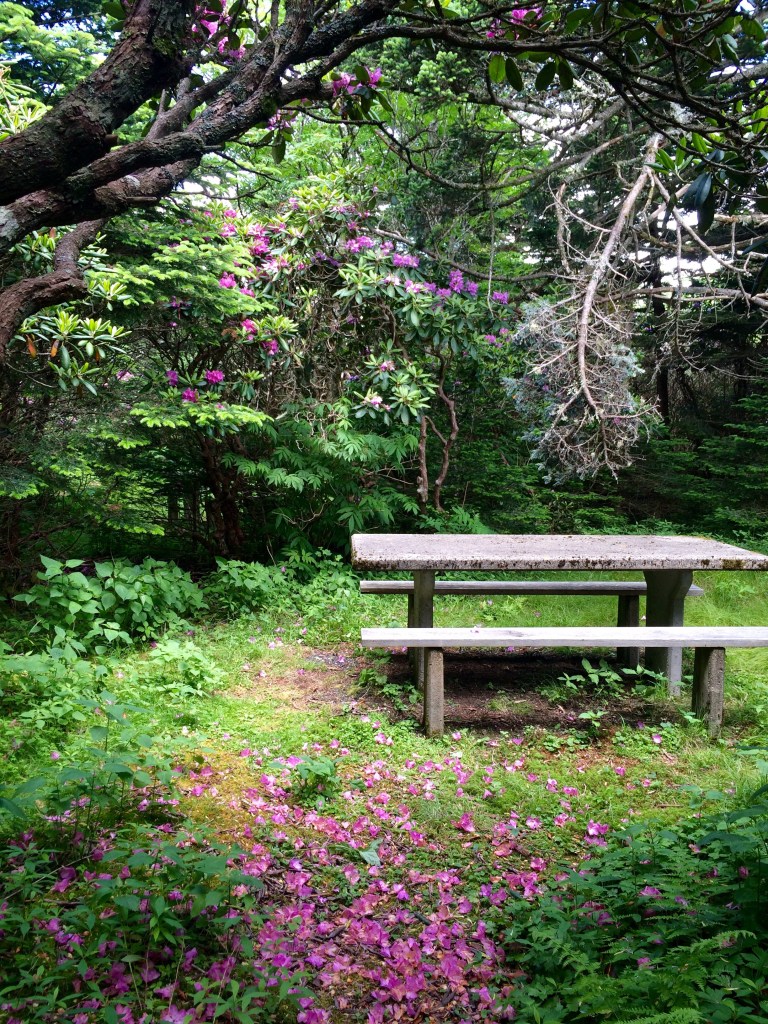 But the best part are the picnic areas. Tucked away in corners of the park are picnic areas. Moss covered tables nestled under pines and the rhodendrons. As the flowers fall they cover the ground creating a pink carpet. A fairytale setting for a romantic picnic!