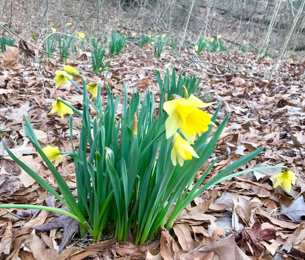 The trail passed by an old cabin and continued toward a boardwalk. Bright yellow daffodils filled the hillside, adding pops of color to what otherwise was all grays and browns. A lone tree frog chirped in the distance; a brave soul letting us know that, despite the chill and wind, spring was on its way.