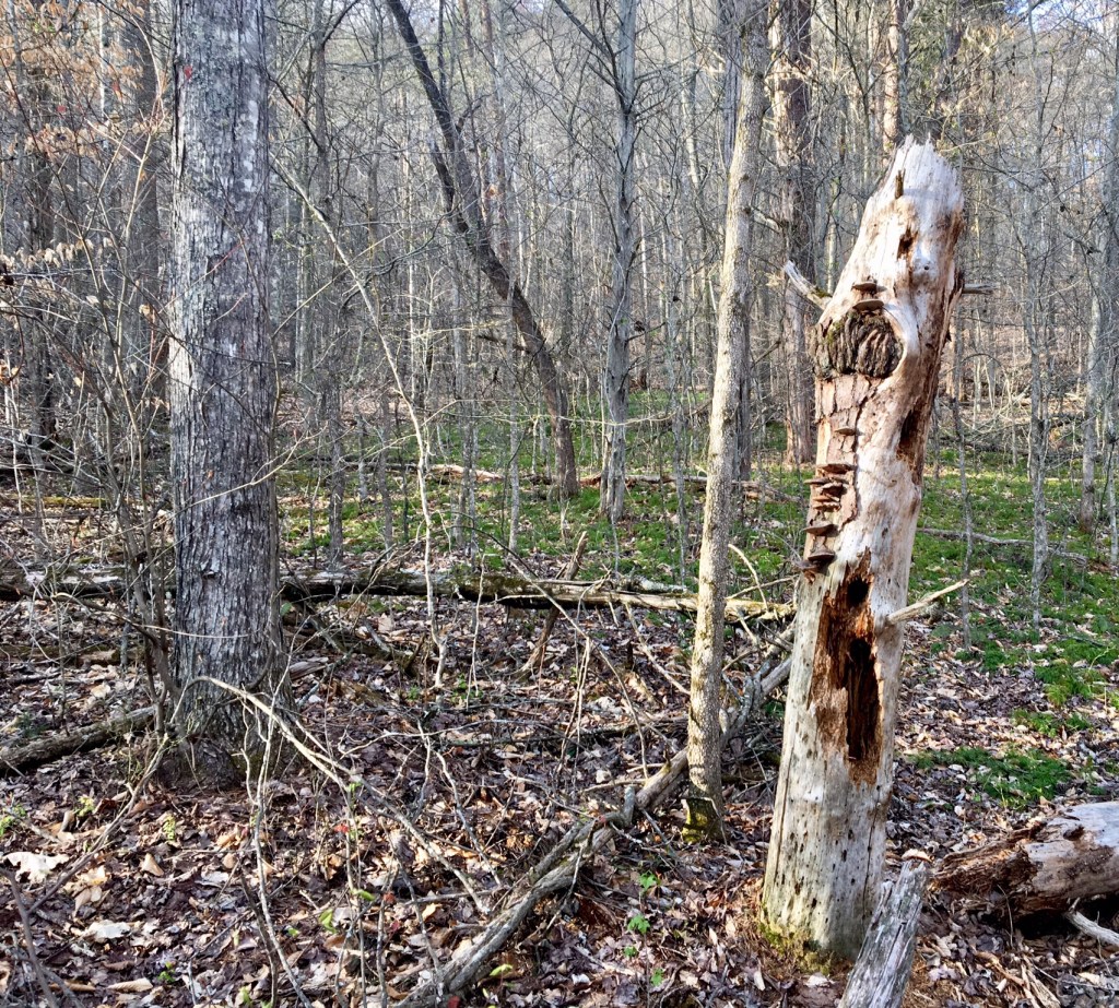 I continued on and soon came to Ghost House Loop which dove even deeper into the woods. The trail wound its way through a spongy valley floor, making numerous crossings over a creek that appeared to be trying its hardest to hurry out of the area. I soon came to the sight of Maston Hutchinson’s “ghost house”. The house, long gone now, was supposedly haunted and legend has it that his restless spirt still roams the area. I saw no restless ghosts, but did see a the remains of a spooky tree keeping a watchful eye over the spot where the house once stood.