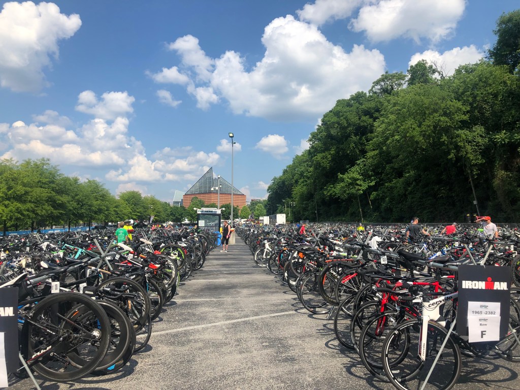 My nerves were high as I walked the few blocks from my hotel room to the transition area of the race. When I arrived the whole scene had an otherworldly feel to it. At 5am, it was still very dark, so temporary lights had been set up to illuminate the entire transition area which held 2700+ bikes. A man with a megaphone announced over and over “you must be marked before you can enter transition”, while a seemingly never-ending line of people quietly boarded buses that would fill and pull away. It all had the feel of something much more sinister than a race!