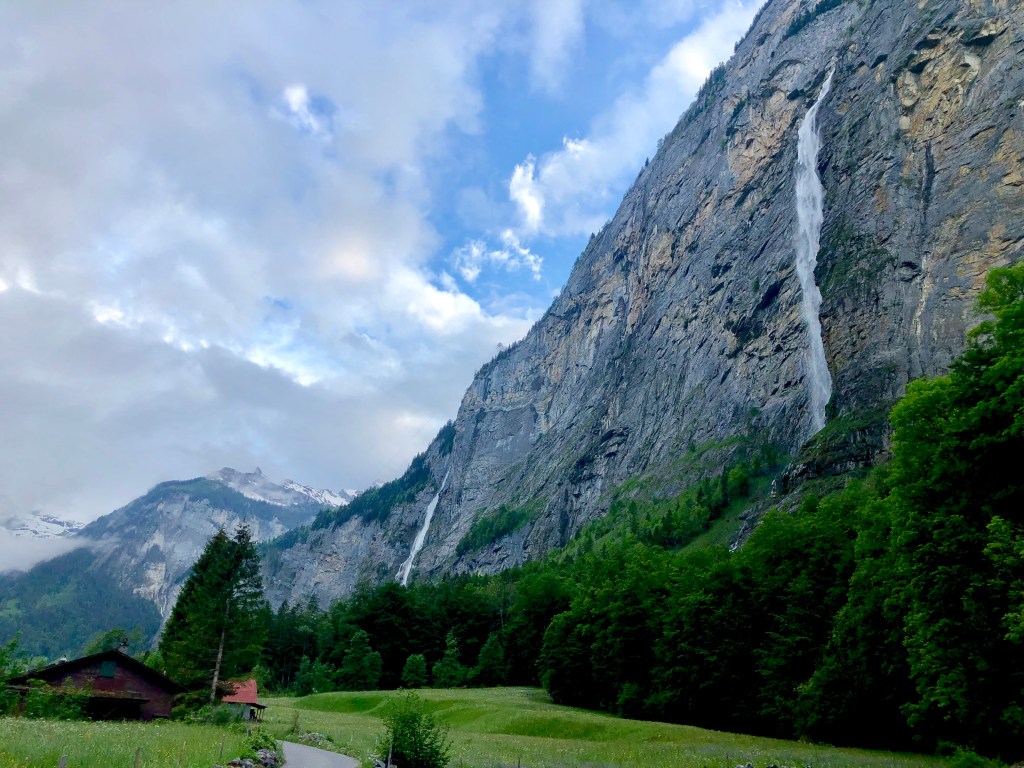 A total of 72 waterfalls thunder down into the Lauterbrunnen Valley from towering steep walls of rock. The valley itself is only about one kilometer wide and sheer walls of rock rise up on either side. In the distance snow capped mountains rising from flowered alpine meadows frame the entire scene. It’s all so magical!