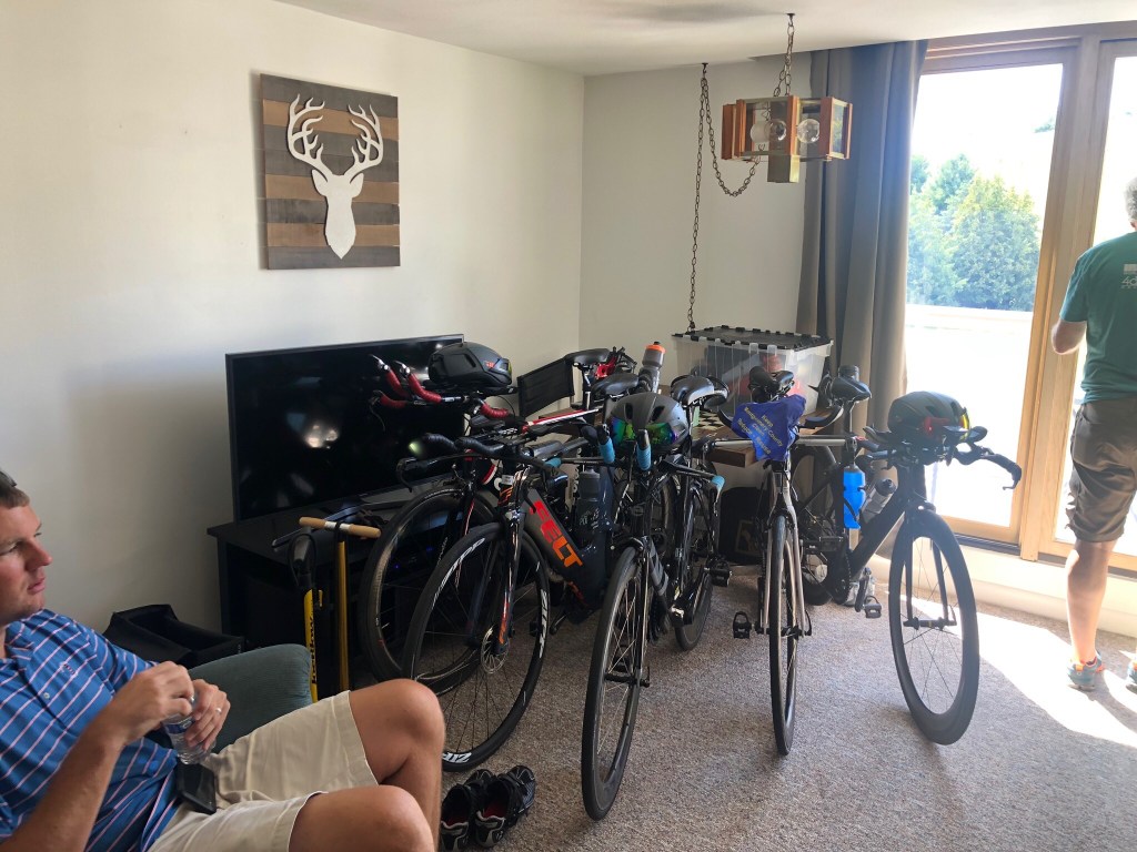 The house quickly took on the feel- and smell- of a frat house with all of us piled in and our gear spread out everywhere. The main living room was filled with 6 bikes and a bunch of recovery gear. There was always someone tinkering with a bike, filling water bottles, or using the NormaTec boots in that room. The kitchen contained, along with all of our food, about 50 bananas, gallons and gallons of water, and little spilled piles of white UCAN powder everywhere. An assortment of running shoes in the corner added a lovely smell to it all. It was crowded, it was chaos at times, but I wouldn’t have done it any other way. It was just so much fun!