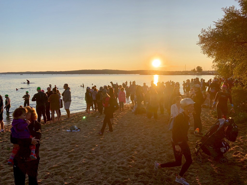 The vibe down by the water had the typical pre-race feel of nerves and confusion and excitement. The sun finally began to rise over the water to reveal perfect conditions for the wetsuit- legal swim in the 70 degree West Grand Traverse Bay of Lake Michigan. Just the day before the lake had been choppy and filled with white caps, but race day was glass!