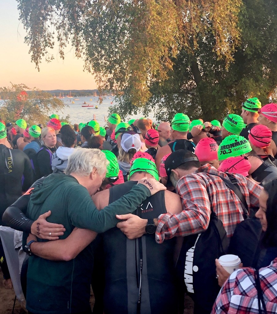 Our Music That Moves team all huddled up for a quick prayer and then hugged our swimmers goodbye as they headed down to the start. The swim for the age groupers was self seeding and they let people in about 5 at a time. The water was beautiful, especially to us from the land of green lakes. It was crystal clear, cool, and smooth. The consensus after the race from anyone that you spoke with was that the swim was amazing.