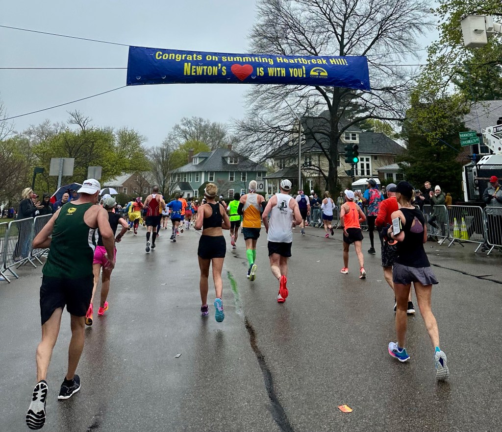 All too soon we were at mile 17, the start of the much talked about Newton hills. The crowds there were amazing; their cheers pushing everyone up to the crest of each hill. We got up the hills without issue, probably because it was a cool day, we were not racing, and we had done some crazy hill training leading up to Boston on hills that made the Newton hills seem flat. I actually think the hills were a good distraction during the miles of a marathon that can often just have you over it all. It’s a goal to focus on accomplishing in the middle of the race. I reached the top of Heartbreak Hill and someone next to me said- it’s all downhill from here. I smiled excited with how close I was getting to the finish line.