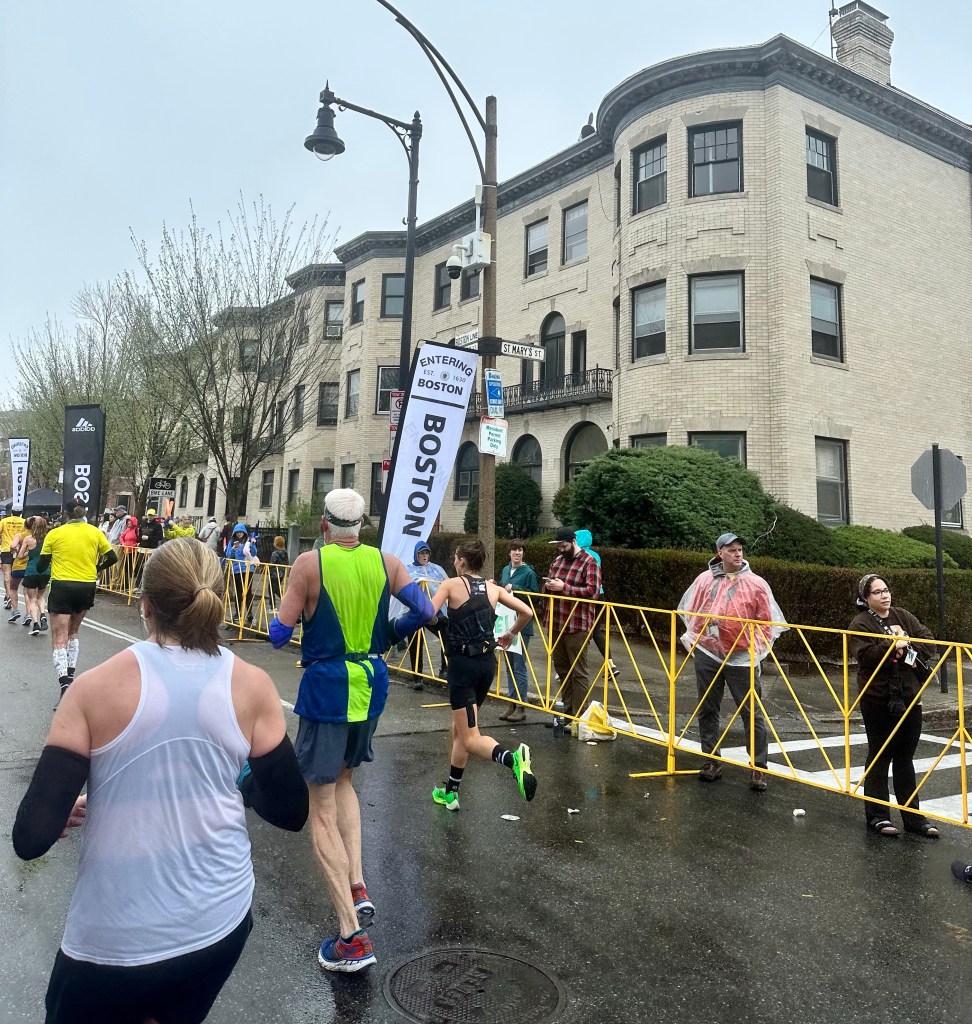 It’s not exactly all downhill from there, but definitely net downhill again. Around mile 23 I hit the ‘I’m over this’ part of the run. I still felt fine, I was just sick of running. Alicia and I also separated for the first time around this point. The course was getting chaotic again with some people slowing down and others speeding up while the road narrowed to accommodate the spectators. For the first time I looked at my watch to see when I would be at the next mile. Then I saw a sign ahead announcing that the course was finally about to enter Boston.
