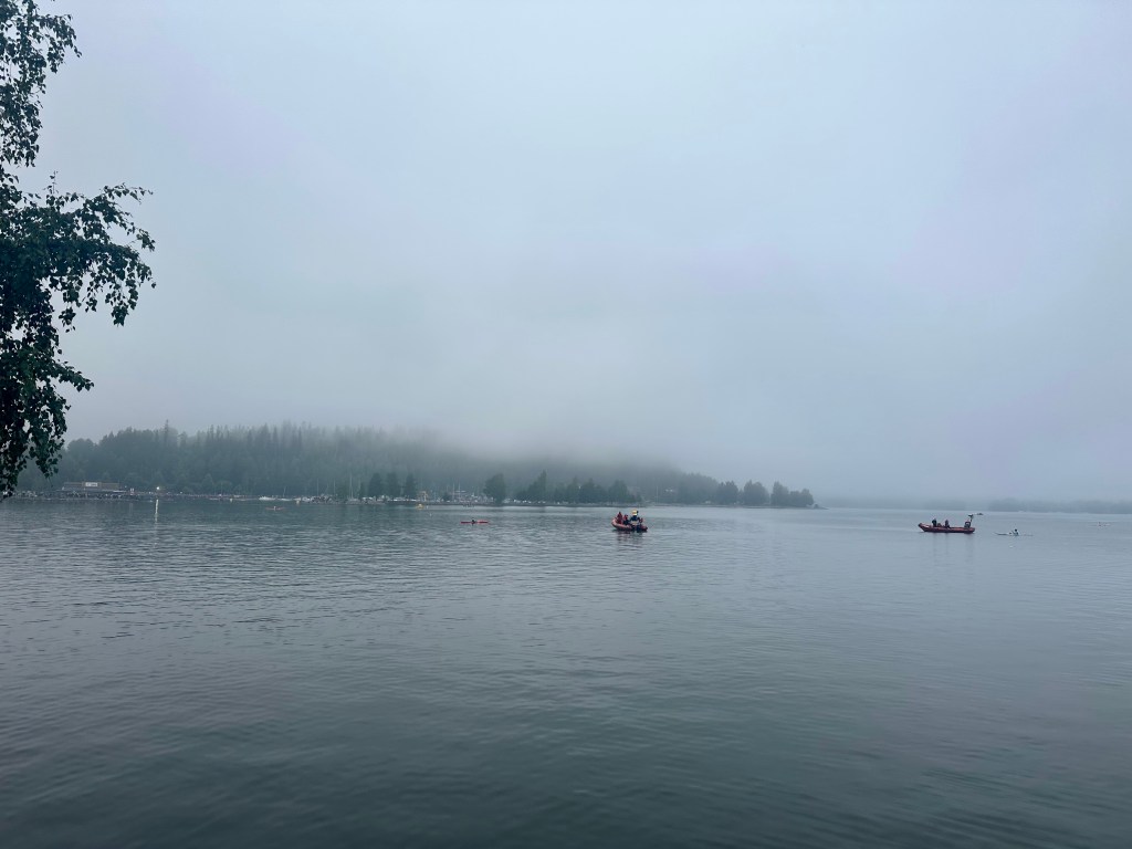 Race day dawned cool and foggy. So foggy that they delayed the start by a half hour to let the fog lift off of the lake so we could see the buoys. The pro women went first and then we all started by the age group we were in. My age group, 45-49, is the last to go which meant that I didn’t start until an 1:40 after the first wave started. I always try to start towards the front in races that we can self seed ourselves in, so the wait just felt like forever. The only cool thing about going last is that I got to watch all of the pro women start the bike portion of the race.
