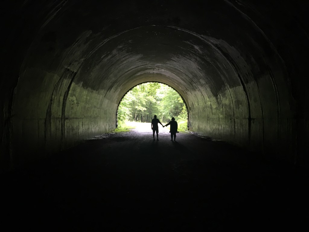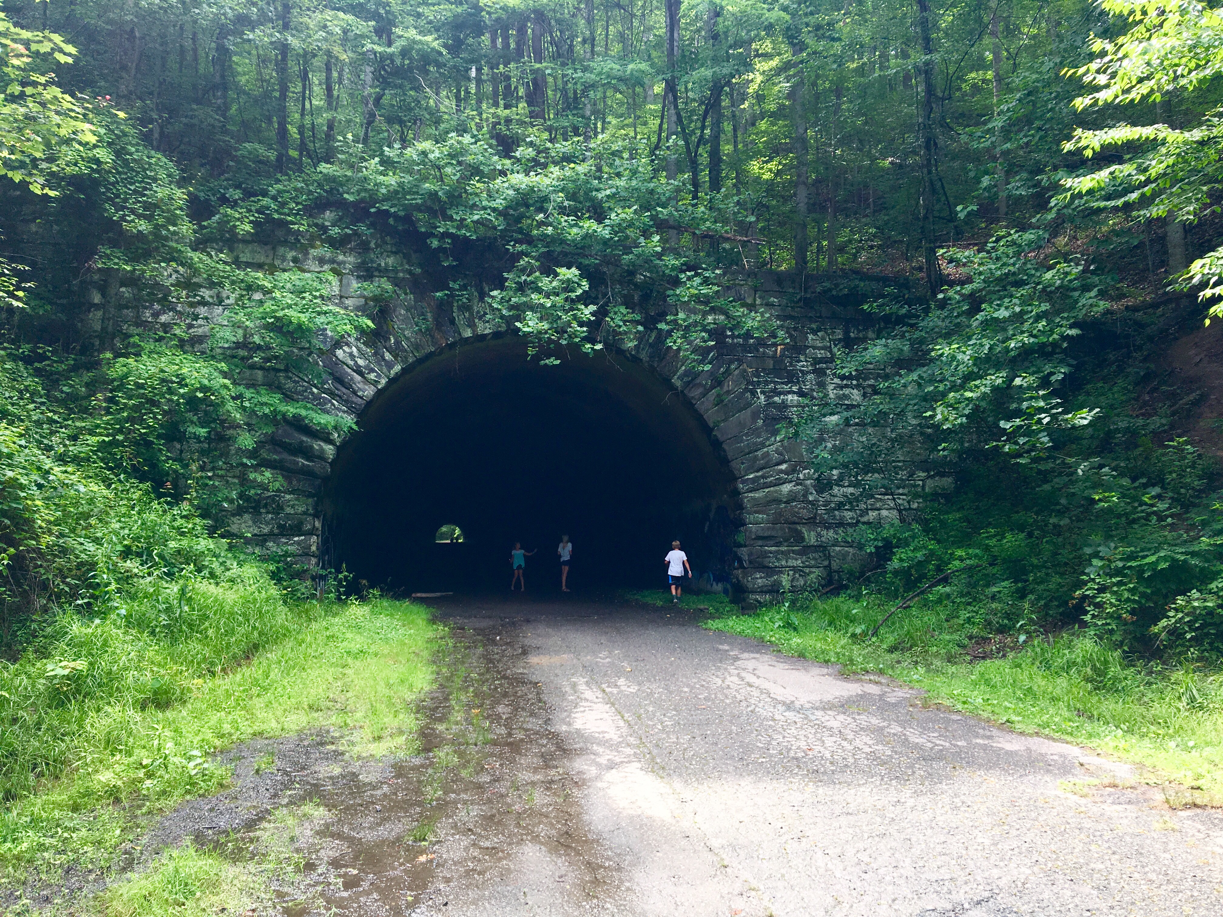 The road now follows the lake about six miles into the park and abruptly ends at a tunnel. It truly is a “Road to Nowhere”. You can now park at the tunnel and hike through it. Once through the tunnel, the asphalt ends and half finished guard rails give way to hiking trails that continue around the lake.